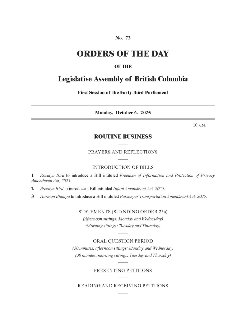 Each published Orders of the Day can be found on the Legislative Assembly website.
